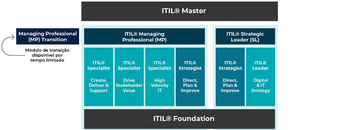 Para os profissionais que estavam no primeiro nível da última versão, o caminho recomendado é iniciar o esquema pela certificação ITIL® 4 Foundation.